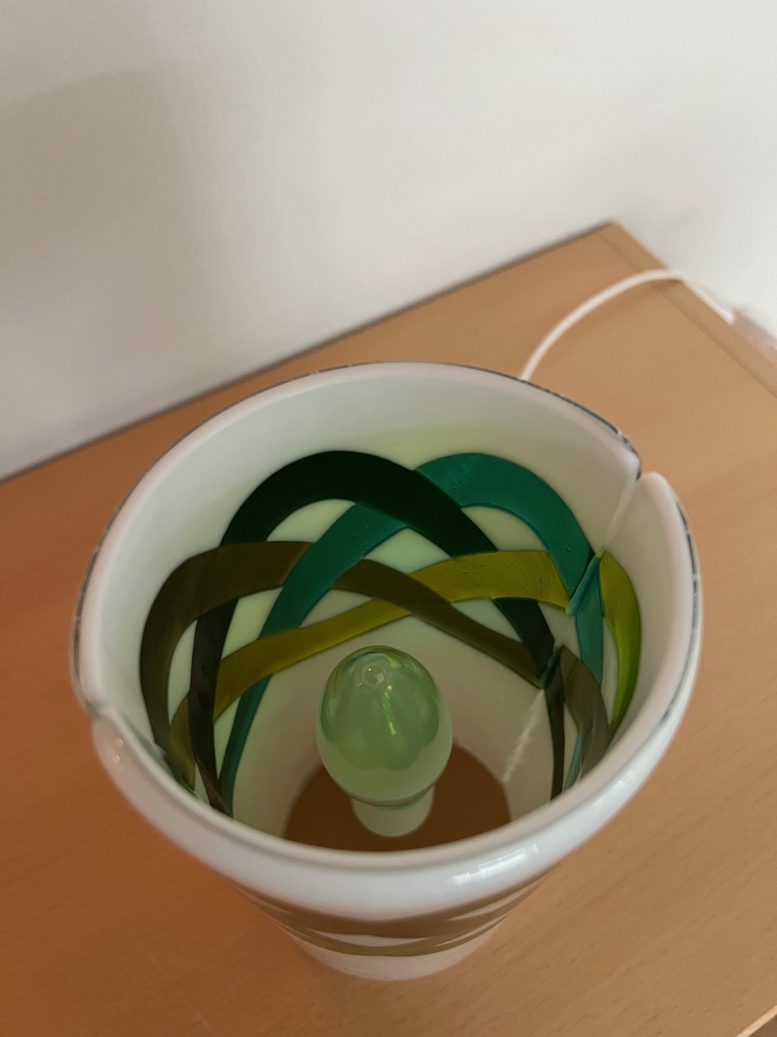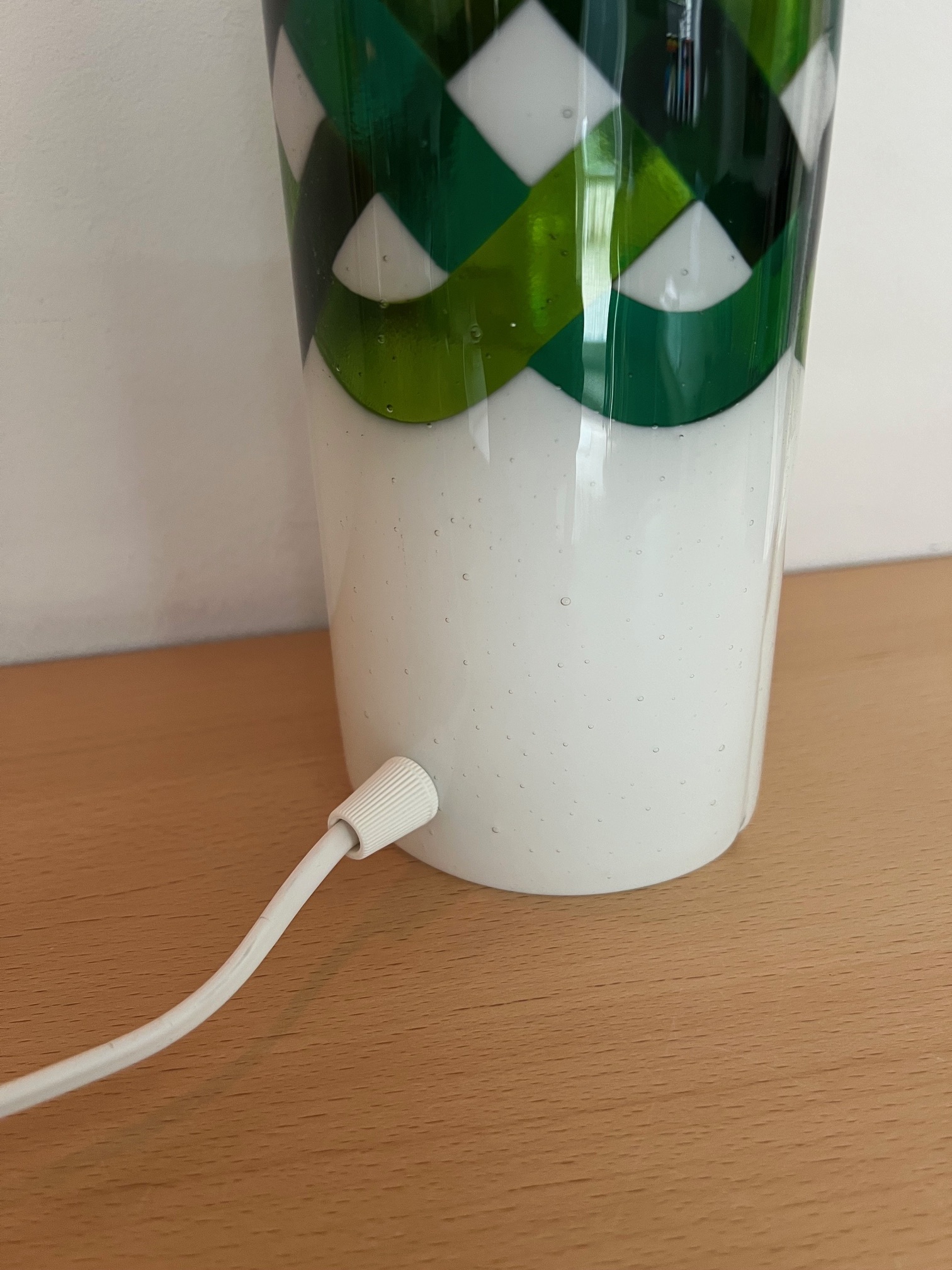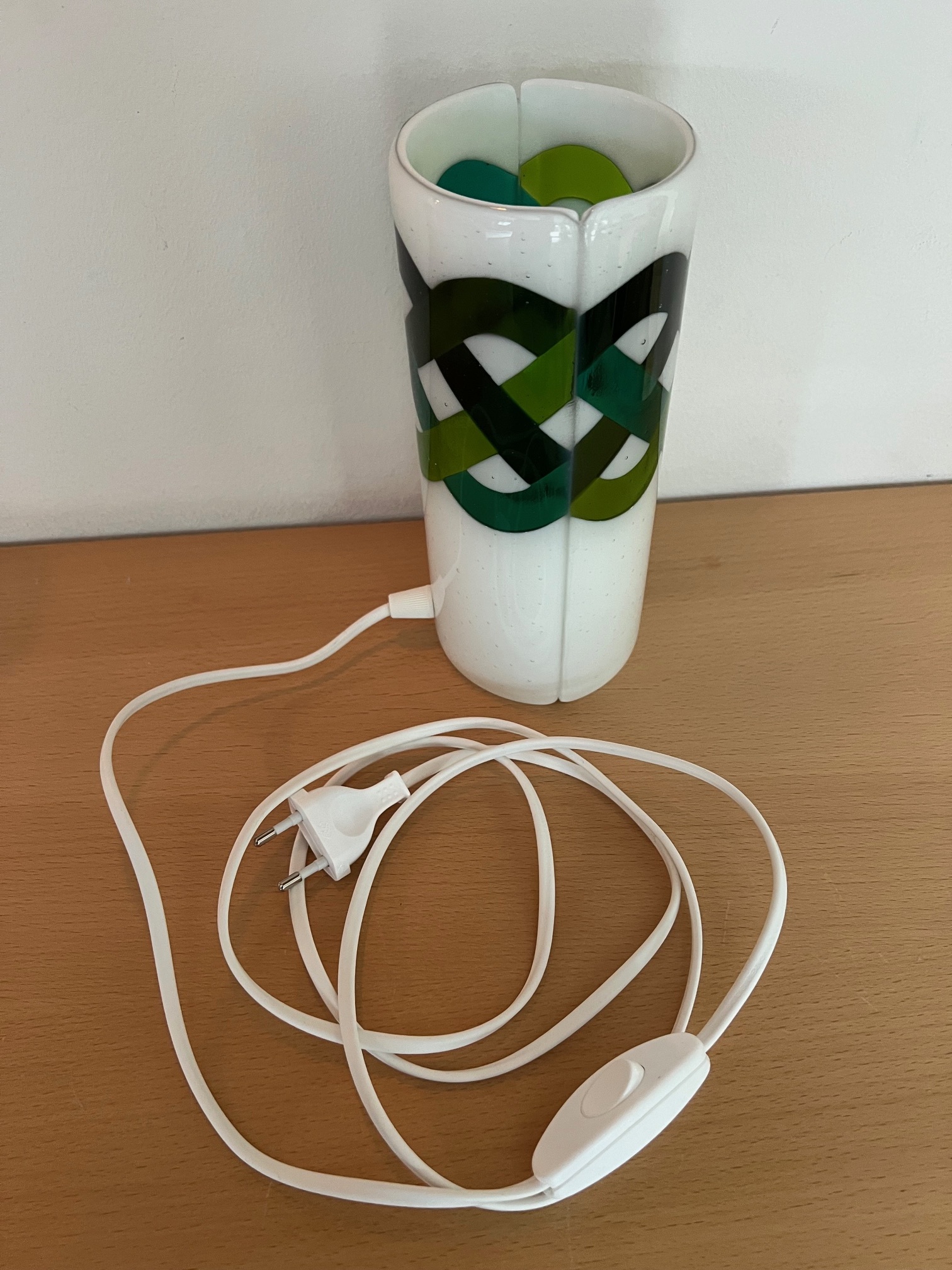 Unika bordlampe i håndlavet glas med grønt “celtic” mønster.