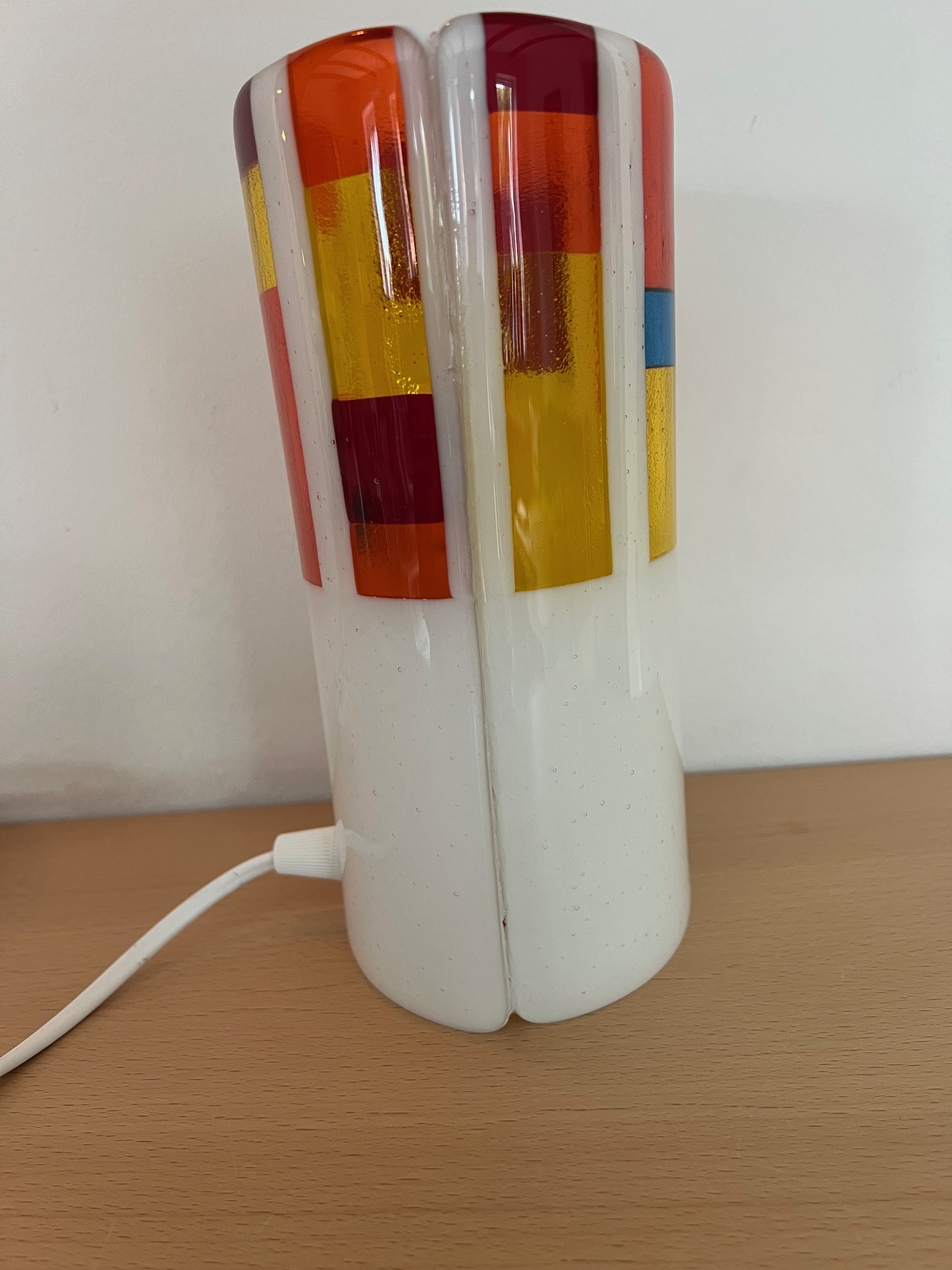 Unika bordlampe i håndlavet glas med vertikale rød-orange striber.