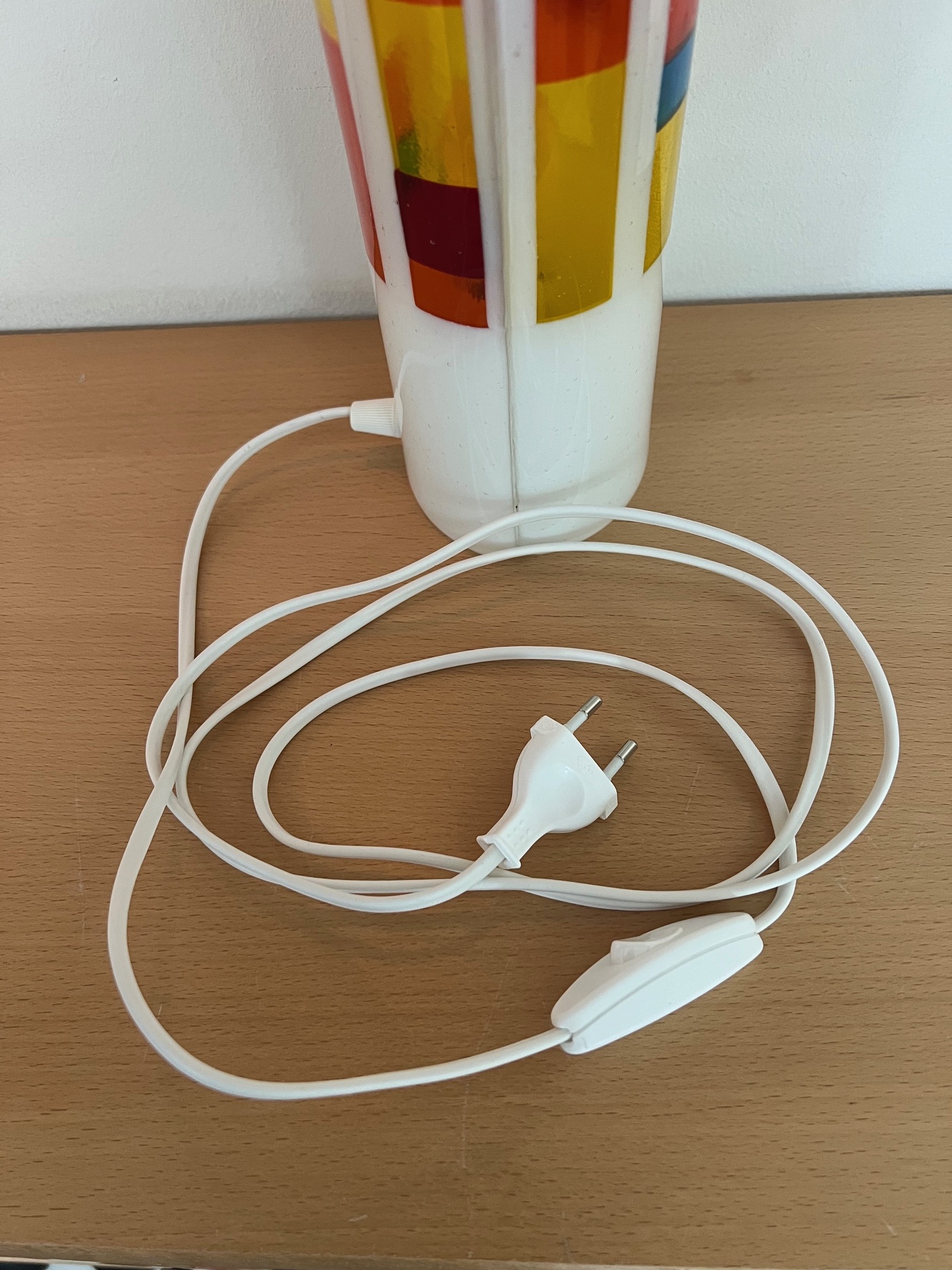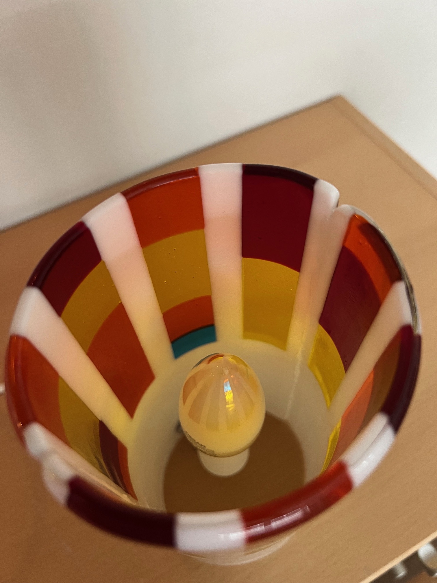 Hver lampe er et unika-stykke, skabt med sans for detaljer og glassets levende spil af lys og farver. Når lampen tændes, fremhæves de fine mønstre og giver et hyggeligt skær – perfekt til både stue, soveværelse eller som et særligt blikfang i indretningen.