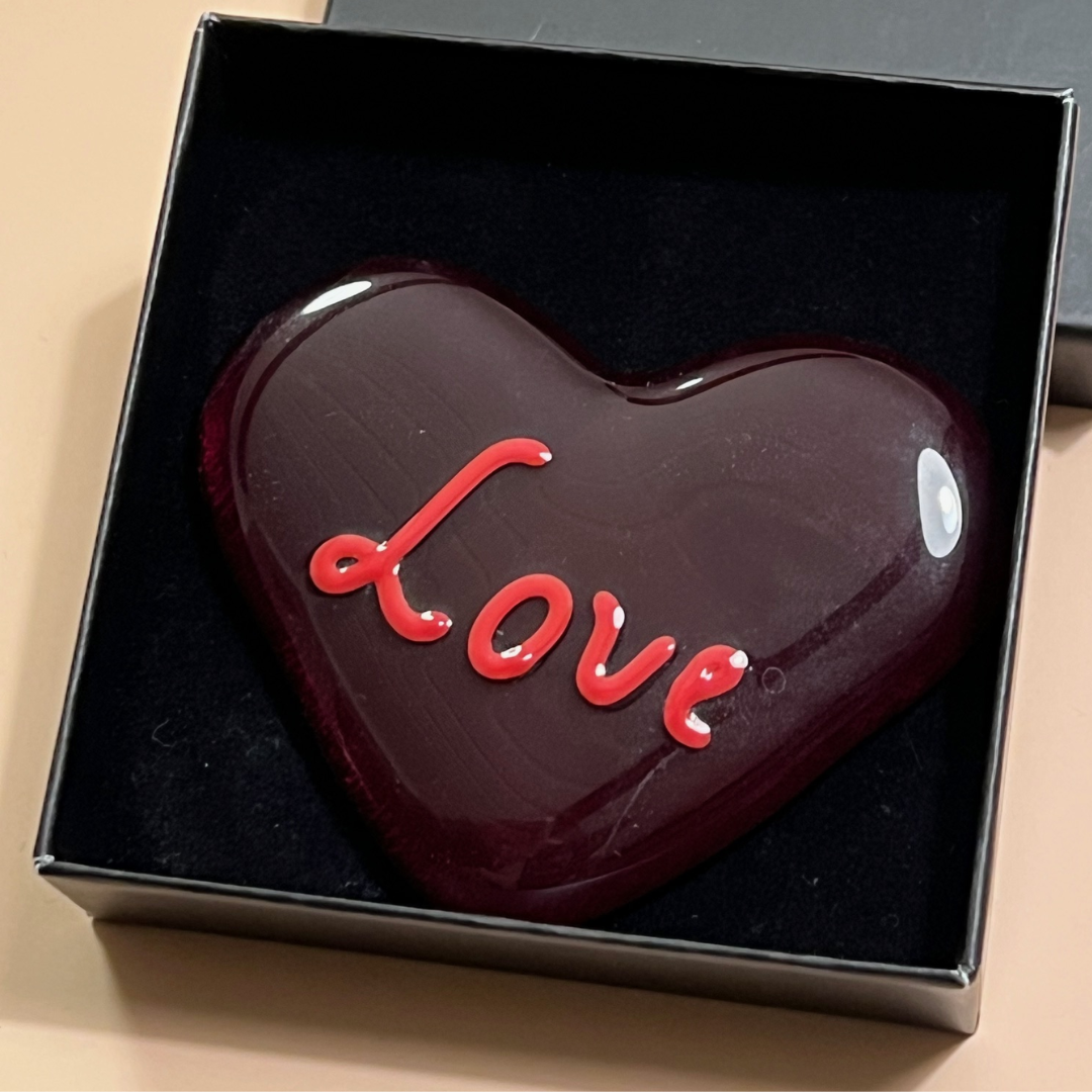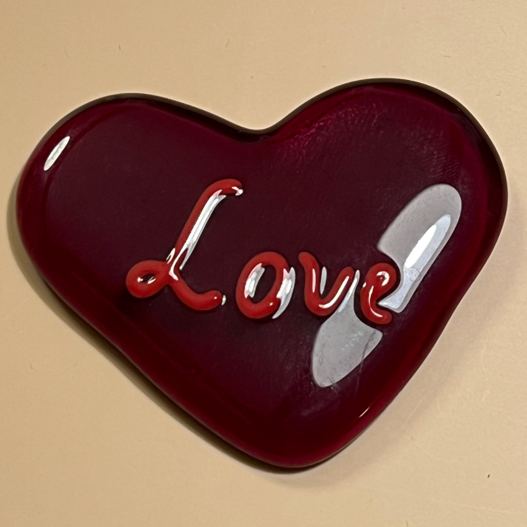 Lækkert rødt hjerte i rødt glas med ordet “Love” smeltet ind i glasset.